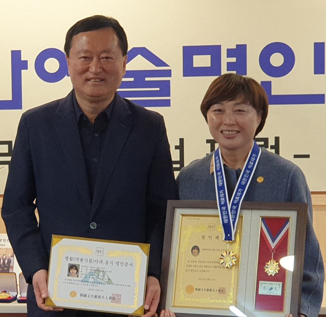 [동양일보 윤규상 기자]충주 ㈜병풀농원 조윤선(오른쪽) 대표가 (사)한국문화예술명인회 병풀약선음식 명인으로 선정됐다.