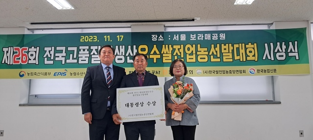 [동양일보 도복희 기자]충북도 충주시 산척면 윤진용 씨가 기른 쌀이 17일 ‘26회 전국 고품질쌀 생산 우수 쌀전업농 선발대회’에서 대상(대통령상)을 수상하며 전국 최고의 쌀로 인정받았다.<사진>