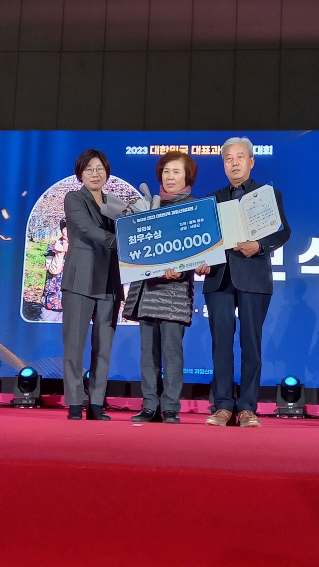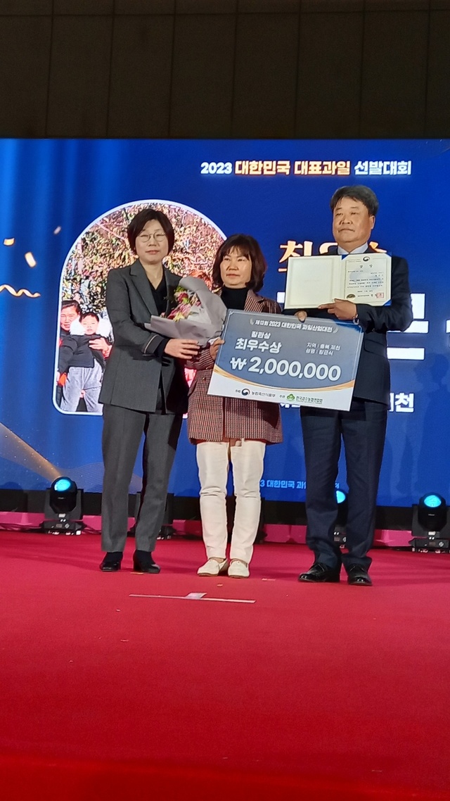 농림축산식품부가 주최하고 한국과수농협연합회 주관으로 지난 24~26일 일산 킨텍스 전시장에서 열린 2023 대한민국 과일산업대전 개막행사와 함께 진행된 대한민국 대표과일 선발 수상자들에 대한 시상식이 열렸다.