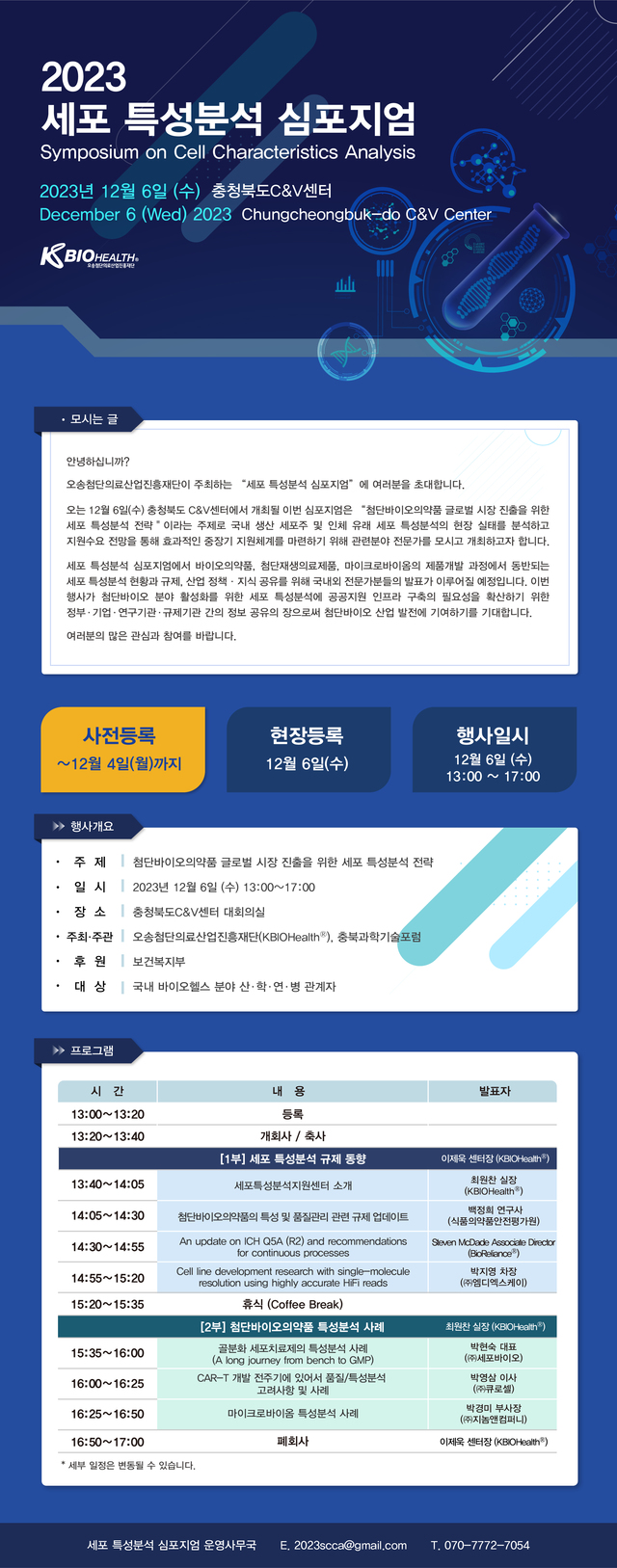 세포 특성분석은 바이오의약품, 첨단재생의료제품, 마이크로바이옴제품 개발에 필수적인 과정이다. 이번 심포지엄에서는 △첨단바이오의약품의 상업화와 글로벌 시장진출을 위해 요구되는 세포 특성 분석과 관련된 규제 △핵심기술·사례를 소개하고 정부 ․ 기업 ․ 연구 ․ 규제 기관의 역할 확인을 통해 준비 전략을 논의할 예정이다.