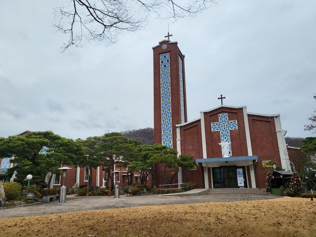 정문을 들어서면 피에타상이 신자들을 반기며 우측에 붉은 벽돌로 지어진 본당 건물이 시원스레 눈에 들어온다.