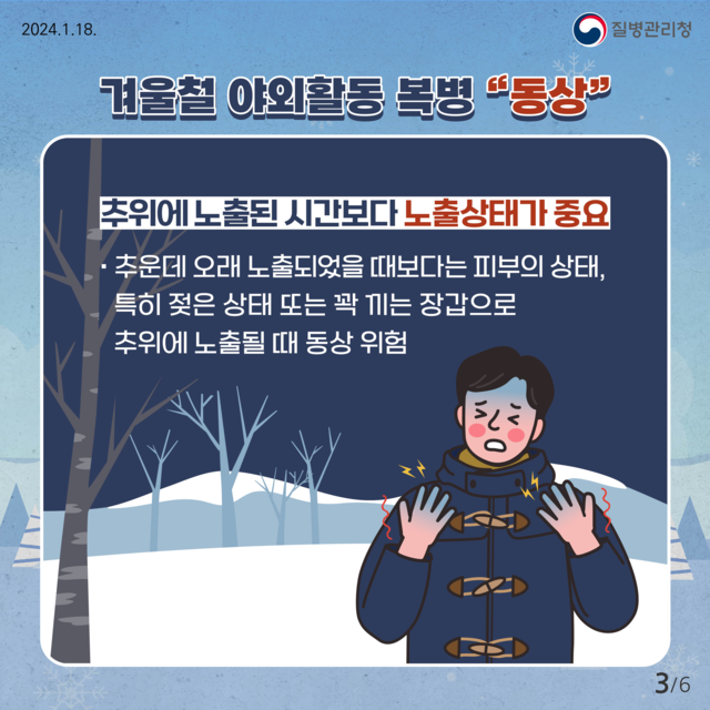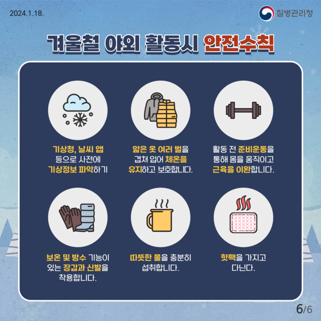 지 청장은 “한랭질환은 사전에 적절한 조치로 예방할 수 있으므로, 한파 시 야외활동 건강수칙을 준수해 줄 것”을 당부하며 “한파가 계속되는 겨울철에는 등산이나 스키타기 등 야외활동을 할 경우 날씨정보를 확인하고 준비운동을 충분히 한 후 보온에 신경을 써야 한다”고 강조했다.
