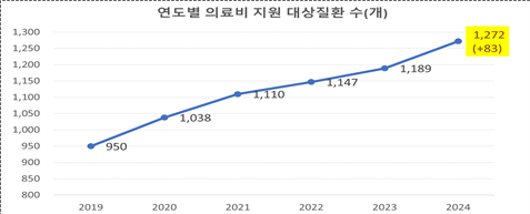 올해부터 희귀질환자 의료비 지원 대상 질환을 83개(2023년 신규 지정 희귀질환) 추가해 1189개에서 1272개로 확대한다. 이에 따라 해당 질환의 의료비 지원 대상자는 요양급여 본인부담금 없이 진료를 받을 수 있어 경제적 부담이 해소될 것으로 기대한다.