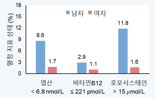 비타민B12의 결핍 또는 경계 결핍 비율은 남자 2.9%, 여자 1.1%로 남자에서 더 높았다. 고호모시스테인혈증(혈중 호모시스테인 농도 15 μmol/L 초과) 비율도 남자 11.8%, 여자 1.6%로 남자가 여자보다 7배 이상 높았다. 혈중 엽산 농도나 비타민B12 농도가 낮은 사람일수록 혈중 호모시스테인 농도가 높은 것으로 나타났다.