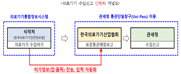 기존에는 민원인이 표준통관예정보고를 위해 식약처로부터 받은 의료기기 허가에 대한 정보 13종(수입업 허가정보(2종) : 수입업 허가번호, 수입업자 허가구분, 품목 허가정보(11종) : 의료기기 분류번호, 분류등급코드, 품목한글명, 품목영문명, 모델명, 제조원·제조의뢰자 상호, 제조의뢰자 주소, 제조원·제조의뢰자 국가, 제조원·제조의뢰자 국가 영문명, 품목허가·신고번호, 품목허가·신고일자)을 관세청 통관단일창구(Uni-Pass)에 직접 일일이 입력해야 했으나 앞으로는 간소화 된다.