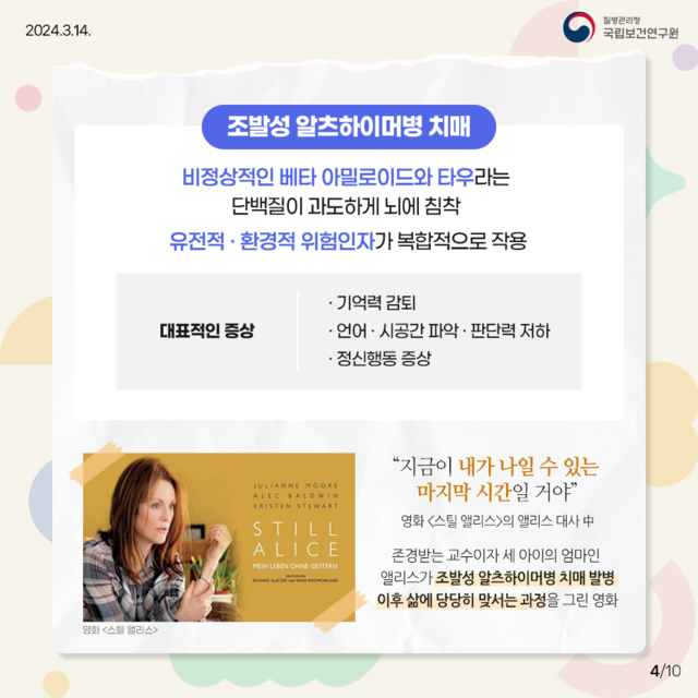 질병관리청(청장 지영미) 국립보건연구원(원장 박현영)은 2024년 세계뇌주간을 맞아 조발성 치매에 대한 국민의 이해를 높이고, 이를 극복하기 위한 해당 연구의 중요성을 알렸다.