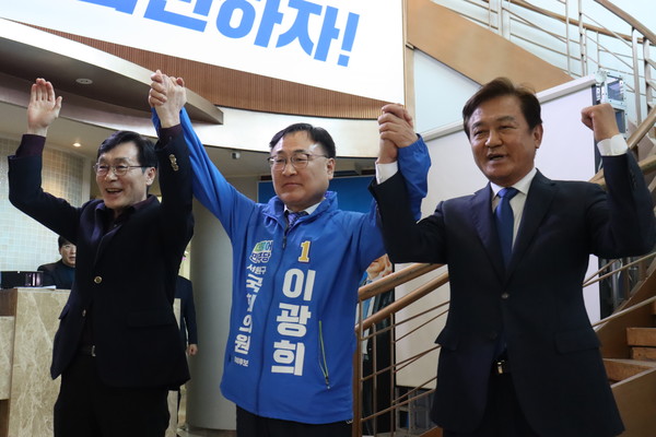이재명 더불어민주당 대표는 축전을 통해 “이광희 후보님 선거사무소 개소식을 축하한다. 위기를 극복하고 국민이 웃을 수 있도록, 더 나은 미래를 위해 민주당의 동지가 되어달라”며 이 후보에 대한 지지를 호소했다.