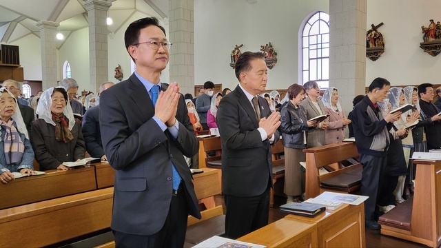 이날 부활미사에는 김영환 충북도지사와 더불어민주당 송재봉 청원구 국회의원 후보가 나란히 참석해 눈길을 끌었다.