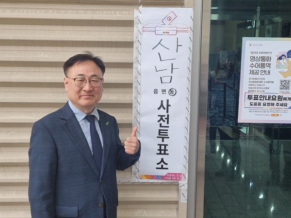 4.10 총선 사전투표 첫날인 5일 이광희 더불어민주당 청주서원 국회의원 후보가 청주교육지원청에 마련된 사전투표소에서 투표를 마친 뒤 기념촬영을 하고 있다. 특별취재팀 이민기 기자