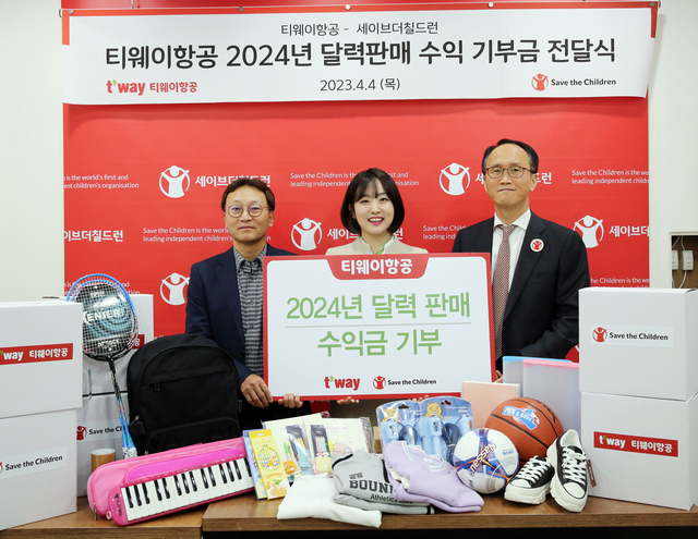 티웨이항공 2024 달력 판매 수익금 전달식은 이날 서울 마포구의 국제아동권리 NGO 세이브더칠드런 본부에서 진행됐다. 판매 수익금 전액은 국내 교육사각지대에 놓인 저소득층 가정의 아동‧청소년들을 위해 새학기 학용품과 의류, 생필품 등 용품지원 사업에 쓰이게 된다.