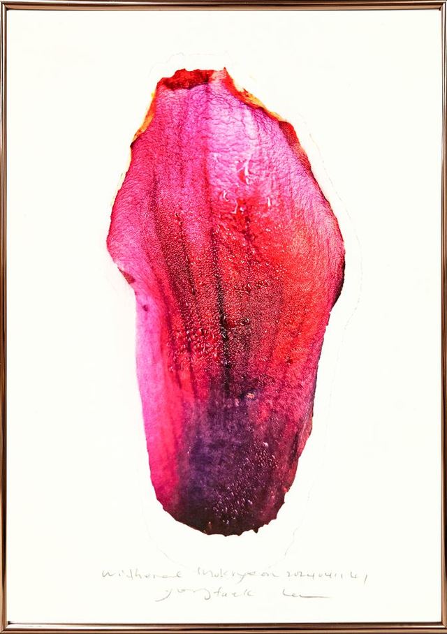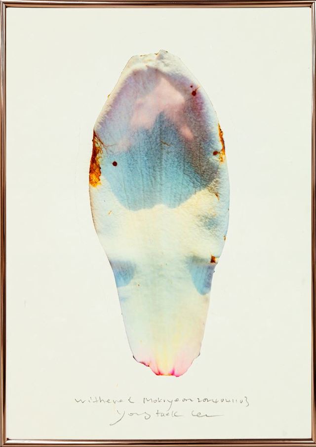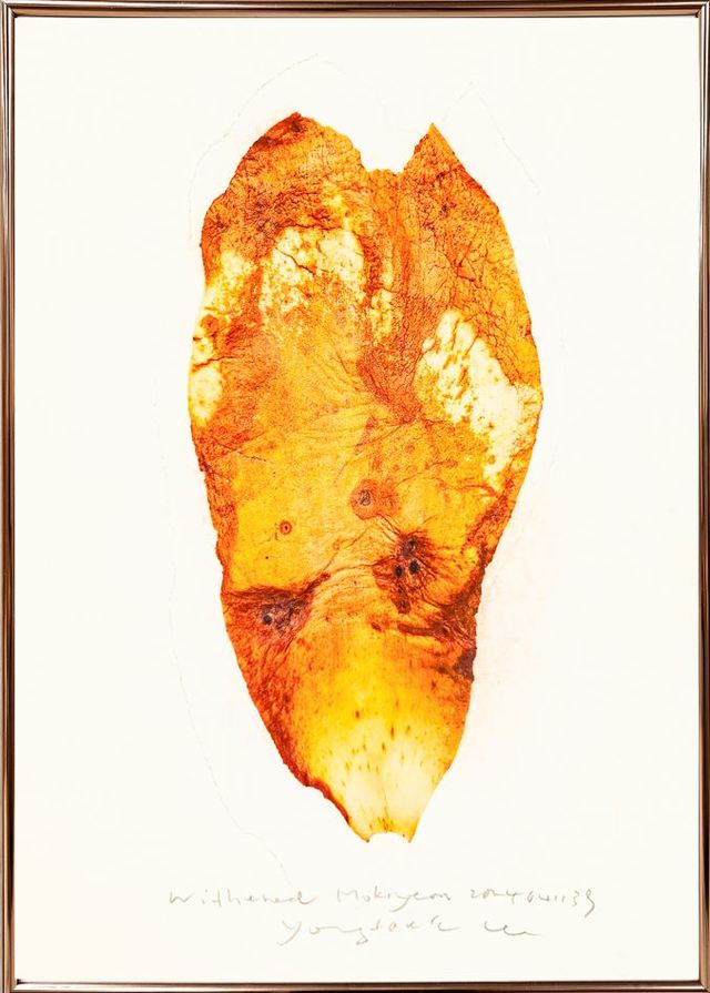 이 작가는 떨어졌거나 시들어가는 모과나 목련꽃잎을 픽쳐링, 이미지 메이킹, 프린팅, 페인팅 등 인고의 과정을 거쳐 물감, 먹, 연필 사인, 액자 등 여러 회화적 장치로 그림으로 보이게 하는 작업을 한다. 작가가 늘 추구하던 애매모호성과도 연결되는 부분이다.