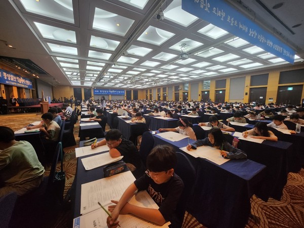 충북지역 영재들의 건강한 지식겨룸 한마당 '동양일보 만물박사 선발대회'가 24일 오후 2시 그랜드플라자 청주호텔에서 열린 가운데 대회에 참가한 학생들이 문제를 풀고 있다. 참가학생들이 문제를 풀고 있다. 지난해 대회에 이어 올해도 '해병대' 티셔츠를 입은 학생이 등장했다. 대회에 참가한 6학년 학생이 답안지를 제출한 뒤 기념촬영을 하고 있다. 짧다면 짧고 길다면 긴 1시간30분의 시험시간. 몸이 뻐근했는지 한 학생이 독특한 자세로 문제를 풀고 있다. 양손 권법(?)으로 빠르게 문제를 처리해나가는 참가 학생. 이번대회 최후의 1인 이한건(산성초ㆍ6년)학생이 시험종료 1분을 남기고 마지막까지 집중하고 있다.