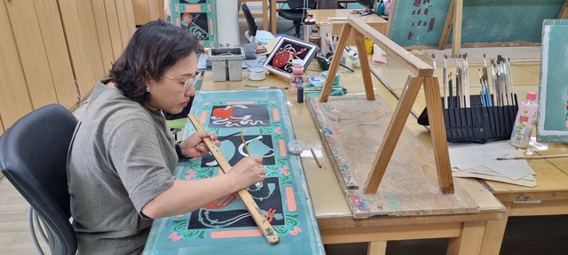 교육원을 찾아갔을 때 수업이 한참 진행 중이었다. 연령대가 다른 교육생들이 한 교실에서 작업을 하는데 몰두하고 있었다. 유물의 현상을 모사하는 손길이 한 치 흐트러짐이 없다. 선을 긋고 채색하는 가운데 누구 하나 집중하지 않는 이가 없었다. 수업을 받는다기보다 각자의 작업에 빠져 있는 모습이었다. 교육생들은 국가유산을 수리하는 전문인력으로 거듭나기 위해 현재의 시간을 최대한 활용하고 있다는 생각이 들었다.