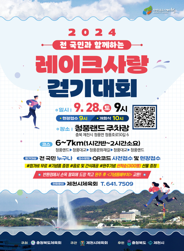 [동양일보 장승주 기자]제천시체육회(회장 안성국)는 오는 9월 28일 아름다운 풍경 청풍호반에서 ‘2024 레이크사랑 걷기대회’를 진행한다.