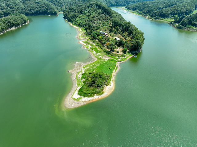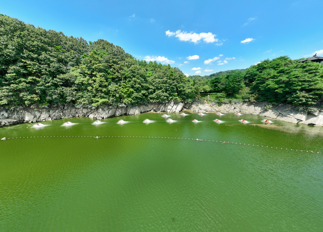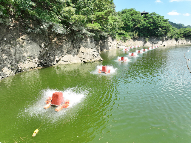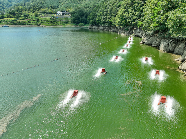 [동양일보 손상훈 기자]연일 폭염이 이어지는 19일 옥천군 군북면 추소리 부근 대청호에 녹조가 발생해 녹조발생을 저감시키는 수면포기기가 가동되고 있다. 녹조는 호수 또는 유속이 느린 하천에 발생하며 장마 이후에 무더위가 지속되면 수온이 올라가고 이로 인해 녹조류와 남조류가 크게 늘어나 물빛이 녹색이 되는 현상을 말한다.