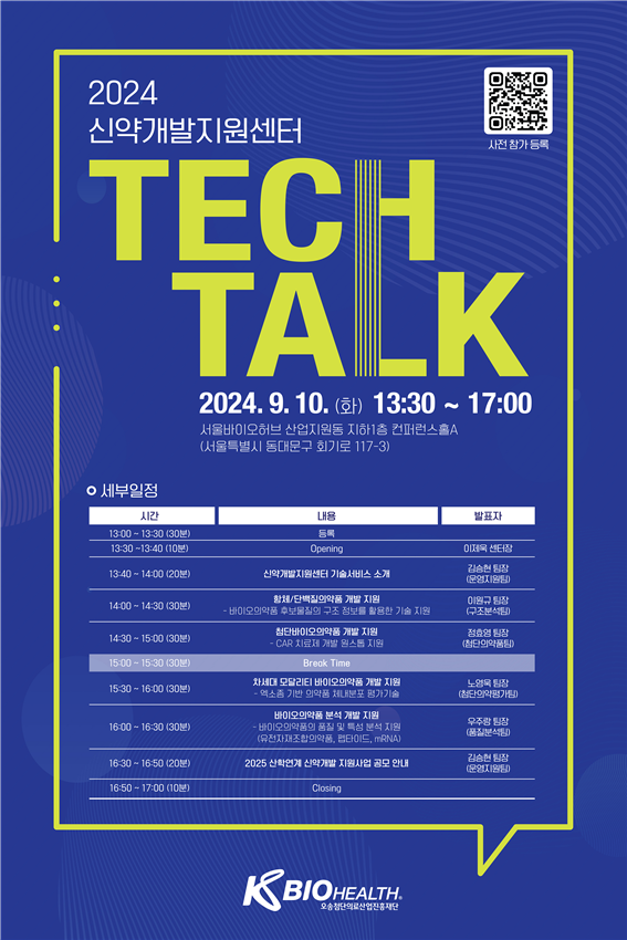 [동양일보 유명종 기자]오송첨단의료산업진흥재단(이하‘KBIOHealth’)은 10일 서울바이오허브에서 ‘2024 신약개발지원센터 Tech Talk’ 행사를 개최한다고 4일 밝혔다.