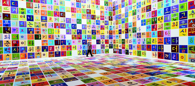 강익중의 전시는 1층 전시장에서 시작한다. 전시장에 들어서면 높이 10m의 높은 벽과 바닥을 빼곡히 채운 색색의 한글에 위압감이 느껴진다. 강익중이 40년 가까이 비망록처럼 적었던 ‘내가 아는 것들’ 모두 3000자, 200문장이다. 결혼 직후 장모로부터 “자네는 아는 게 뭔가?”라는 질문을 들은 뒤 그날부터 자신을 돌아보며 아는 것을 공책에 적기 시작했단다.