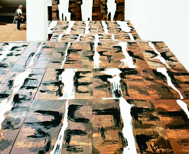 그는 그 많은 문장들을 벽에는 페인트로, 바닥엔 시트지로 붙여 나갔다. 2층 전시장에는 3인치 캔버스 1만여 개에 다양한 오브제들이 곁들여진 ‘삼라만상, 해피월드’, ‘달항아리’ 시리즈와 ‘1000개의 드로잉’, ‘꿈의 다리’ 등 작가의 주제의식을 보여주는 작품들이 전시됐다.