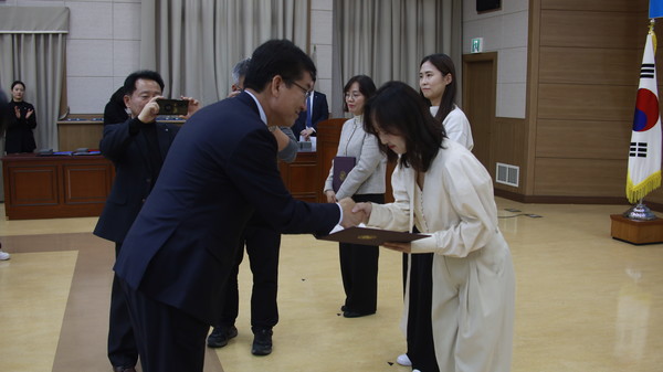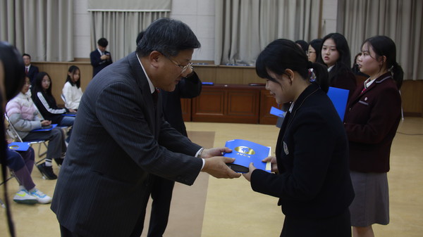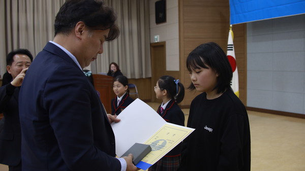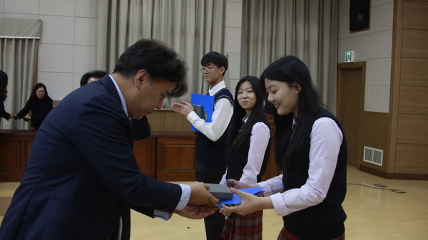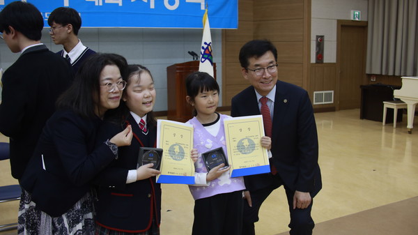 동양일보가 578돌 한글날 기념으로 개최한 14회 ‘우리말글겨루기대회’ 시상식이 열린 15일 청주시 서원구 산남동 충북도교육청 화합관에서 ‘우리말글겨루기대회’수상자에게 시상을 하고 있다. 손상훈 기자 mjsh9370@dynews.co.kr
