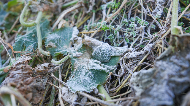 [동양일보 손상훈 기자]최저기온 -4~1도의 영하권의 아침추위가 이어지고 있는 19일 청주시 서원구 모충동의 한 호박밭의 호박잎과 풀잎에 하얀 서리가 내려앉아 있다. 서리는 공기 중의 수증기가 낮은 기온에 승화된 것이며 식물의 잎에서 증산하는 수증기가 그대로 얼면서 서리를 만들기도 한다. 손상훈 기자 mjsh9370@dynews.co.kr