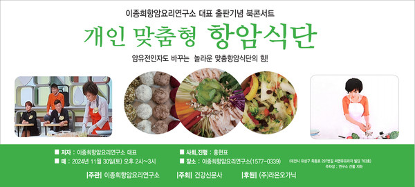 이종희 항암요리연구소 대표의 저서 ‘개인맞춤형 항암식단’이 건강신문사에서 출간됐다. 오는 30일 이종희함암요리연구소에서 출판기념 북콘서트가 열린다.