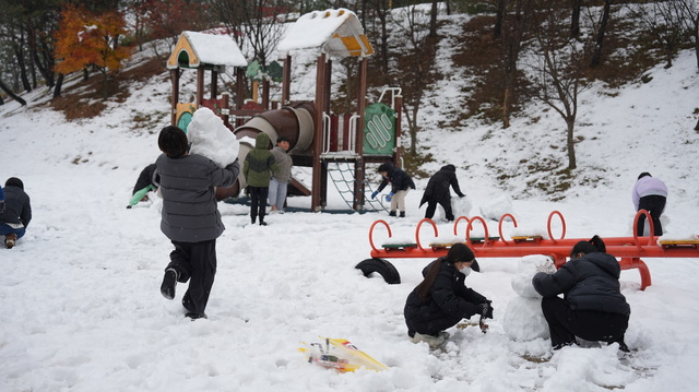 [동양일보 손상훈 기자]함박눈이 내리고 있는 28일 진천군 진천읍 조명희문학관 인근 공원에서 학생들이 눈사람을 만들며 겨울을 즐기고 있다. 손상훈 기자 mjsh9370@dynews.co.kr