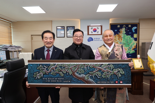 [동양일보 김지유 기자]진천군은 30일 문백면 소재 금성개발㈜의 송기호 회장을 초대해 서각 작품을 선물했다.