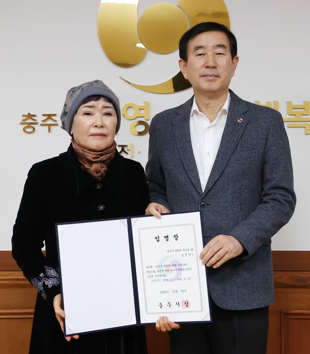 [동양일보 윤규상 기자]충주시가 30일 시청 소회의실에서 심영자<72·사진 왼쪽> 시 자원봉사센터장에게 임명장을 수여했다.