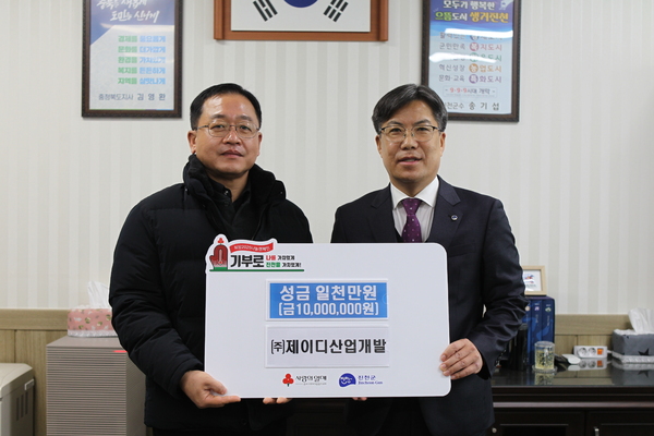 ▲ ㈜제이디산업개발(대표 이영욱.좌측)은 6일 진천군청을 방문해 임보열(우측) 부군수에게 지역복지 발전을 위한 성금 1천만 원을 기탁했다. / 진천군 ㈜제이디산업개발(대표 이영욱.좌측)은 6일 진천군청을 방문해 임보열(우측) 부군수에게 지역복지 발전을 위한 성금 1천만 원을 기탁했다. / 진천군