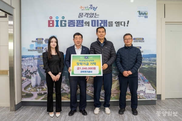 선우전기공사(대표 신정수)는 7일 증평군을 찾아 지역의 우수인재 양성을 위해 써달라며 (재)증평군민장학회에 장학기금 104만원을 기탁했다. / 증평군