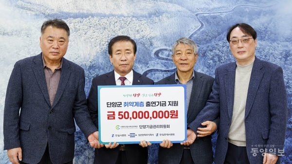 시멘트산업사회공헌재단 단양기금관리위원회 김종태(왼쪽 세 번째) 위원장이 단양군청을 방문해 김문근(왼쪽 두 번째) 단양군수에게 취약계층 지원을 위해 써 달라며 5000만원을 기탁했다. 기탁금은 한일시멘트, 성신양회, 한일현대시멘트 3사가 출연한 기금으로 마련됐다.