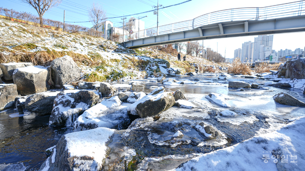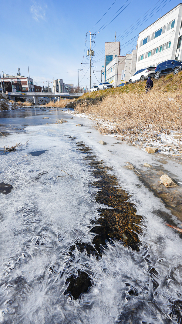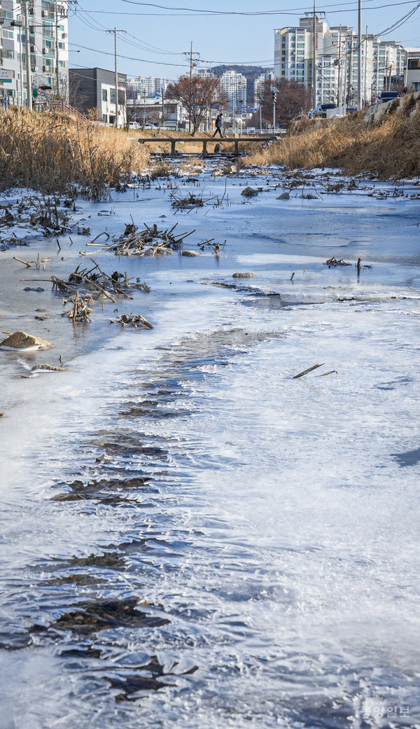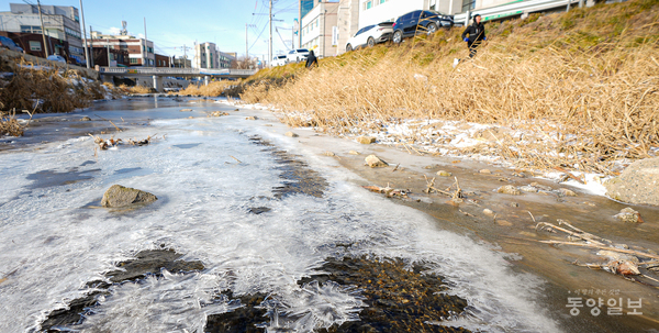 한파주의보가 내려진 9일 청주시 청원구 율량동 율량천의 냇물이 최저기온 영하 10도의 매서운 한파로 꽁꽁 얼어붙어 추위를 체감시켜주고 있다. 손상훈 기자 mjsh9370@dynews.co.kr