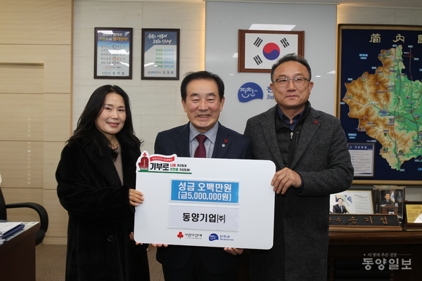 동양기업㈜(대표 이영주, 유성모)은 지난 10일 진천군을 방문해 진천군 기초푸드뱅크 지원을 위한 성금 500만 원을 전달했다.