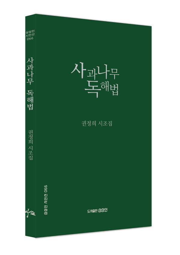 권정희 시인의 시조집 『사과나무 독해법』이 도서출판 상상인에서 출간됐다. 이번 시집은 1부 괜찮아 봄이잖아, 2부 비와 여름의 사간, 3부 오랜된 슬픔의 가을 아래서, 4부 눈물의 뼛조각 같은 별들의 겨울로 구성됐다.