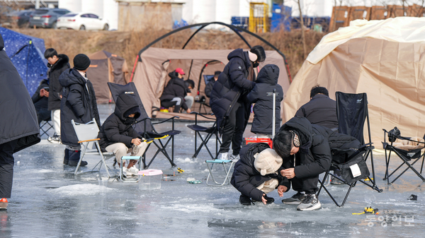 대한을 하루 앞둔 19일 진천군 백곡면 백곡저수지에서 가족들이 얼음낚시를 즐기며 주말을 즐기고 있다. 대한(大寒)은 이름만 보면 대한이 가장 추운 절기 같지만 소한과 대한이 비슷하거나 오히려 소한이 더 추운 경우도 많다. 손상훈 기자 mjsh9370@dynews.co.kr