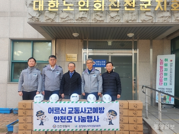 진천경찰서(서장 조성수)는 지난 17일 지역 어르신들의 교통안전과 사고예방을 위해 대한노인회 진천지회에 이륜차 안전모 50개를 전달하는 나눔행사를 가졌다. / 진천경찰서