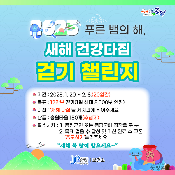 증평군보건소(소장 조미정)가 일상 속 걷기 활성화를 위한 ‘새해 건강다짐 걷기 챌린지’를 실시한다.