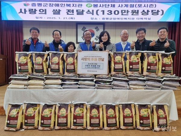 증평에 충청지회를 두고 있는 봉사단체 포시즌은 21일 증평군장애인복지관(관장 정찬연)을 찾아 장애인의 따뜻한 겨울나기 지원을 위한 사랑의 쌀 500kg(10kg 50포, 130만원 상당)을 기부했다. / 증평군