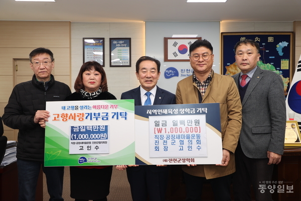 22일 고인수 직장·공장새마을운동진천군협의회장이 진천군청을 방문해 200만 원을 고향사랑기부금과 진천군 장학금으로 전달했다. / 진천군