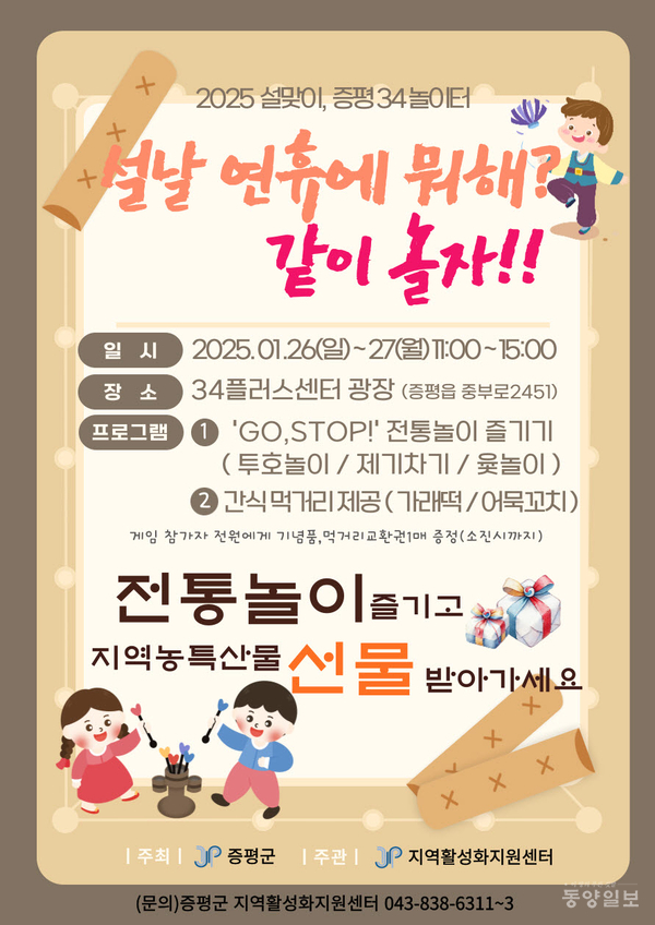 증평군이 설 명절을 맞아 26~27일 오전 11시부터 오후 3시까지 34플러스센터 광장에서 ‘GO, STOP!’전통놀이 즐기기 행사를 진행한다.