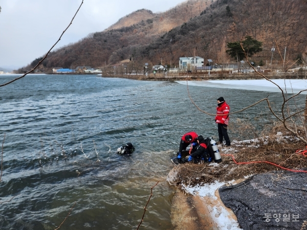 증평소방서(서장 손덕주)는 5일 증평 삼기저수지에서 동계 수난사고 현장에 대비해 잠수 및 안전절차, 수중수색, 구조 능력 향상, 호흡장비 대처능력 등 인명구조훈련을 실시했다. / 증평소방서