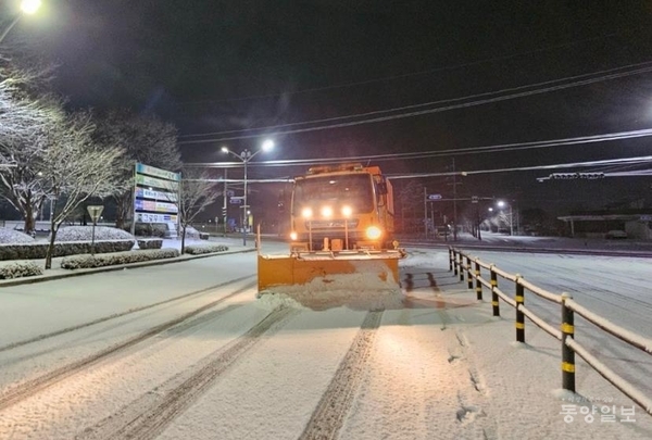 이재영 군수는 “기상 상황을 면밀히 주시하며 추가적인 강설에도 즉각 대응할 수 있도록 긴장의 끈을 놓지 않겠다”며 “군민 안전을 최우선으로 신속하고 철저한 제설작업을 지속적으로 추진하겠다”고 말했다.