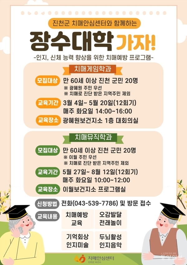 진천군이 어르신들을 대상으로 치매 예방프로그램인 ‘장수대학 가자’ 참여자를 모집한다.
