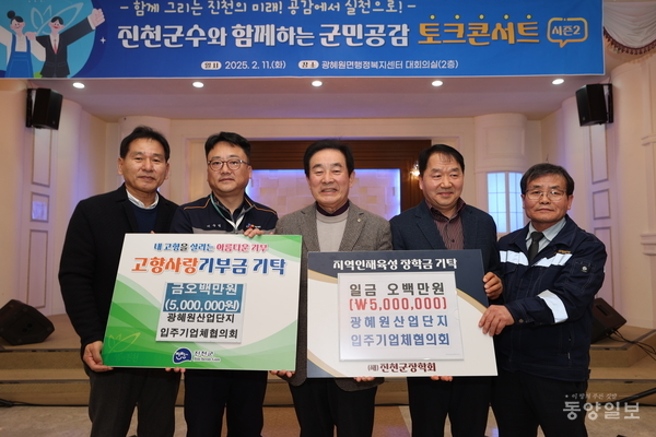 진천광혜원면산업단지 입주기업체협의회(회장 이승범)는 11일 광혜원면 행정복지센터를 방문해 진천군에 고향사랑 기부금 500만원, 장학금 500만원 등 1000만원을 전달했다. / 진천군