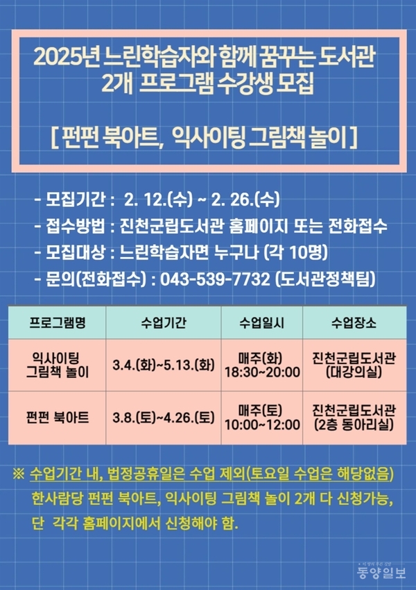 이들 2개 강좌는 오는 26일까지 진천군립도서관 홈페이지(lib.jincheon.go.kr/)에서 신청하거나 유선으로 신청할 수 있으며, 관내 느린 학습자라면 누구나 신청할 수 있다.