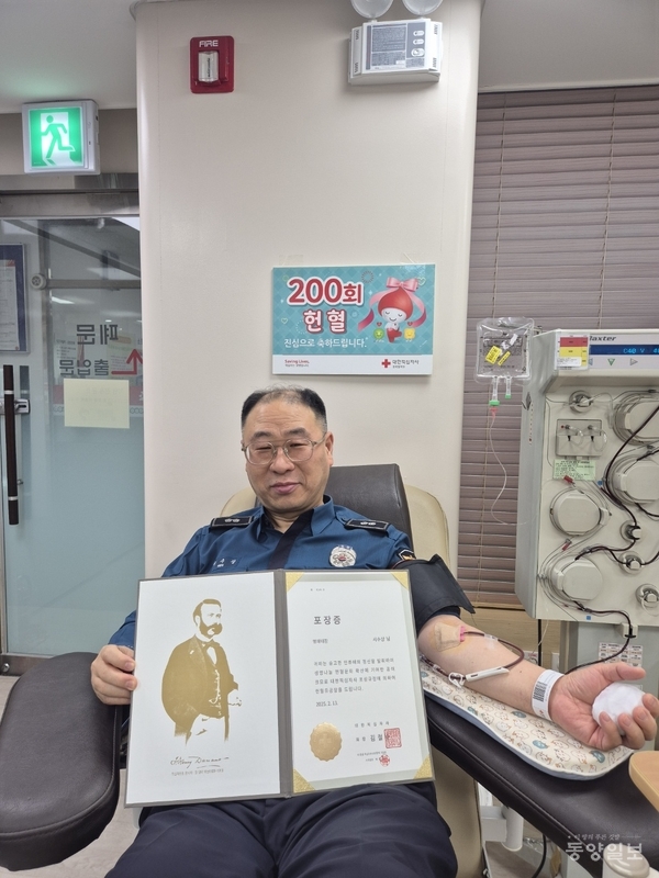 서 경감은 지난 13일 헌혈 200회를 달성해 대한적십자사로부터 헌혈 명예 대장을 수여 받고 대한적십자사 명예의 전당에 이름을 올렸다.