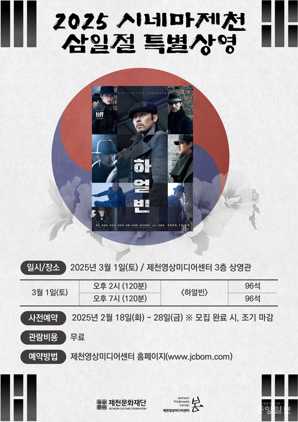 제천문화재단(이사장 김상수)은 삼일절을 맞아 오는 3월 1일 오후 2시와 오후 7시에 제천영상미디어센터 상영관에서 안중근 의사의 의거를 다룬 영화 ‘하얼빈’을 무료로 상영한다.