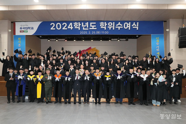 우석대는 25일 진천캠퍼스 지승동홀에서 학생과 학부모 등 200여명이 참석한 가운데 2024학년도 전기 학위수여식을 갖고 학사 213명, 석사 5명 등 218명에게 학위를 수여했다. / 우석대
