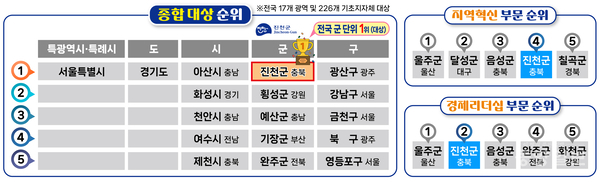 진천군은 부문별 평가에서 △경제리더십 부문 최우수 △지역혁신 부문 우수에 이름을 올렸으며, 특히 전 부문 점수를 합산한 종합순위에서 전국 82개 군 단위 지자체 중 가장 높은 점수를 받아 최정상에 올랐다.