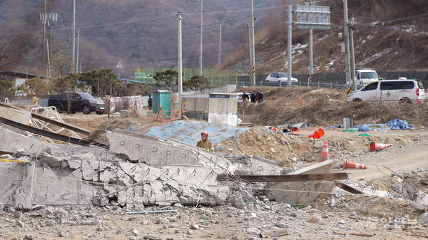 25일 오전 경기 안성시 서운면 산평리의 한 고속도로 공사 현장에서 9공구 천용천교 건설 현장에서 교각에 올려놓았던 상판 4∼5개가 떨어져 내렸다. 교각 위 구조물이 붕괴하면서 인부 8명이 매몰됐다. 손상훈 기자 mjsh9370@dynews.co.kr